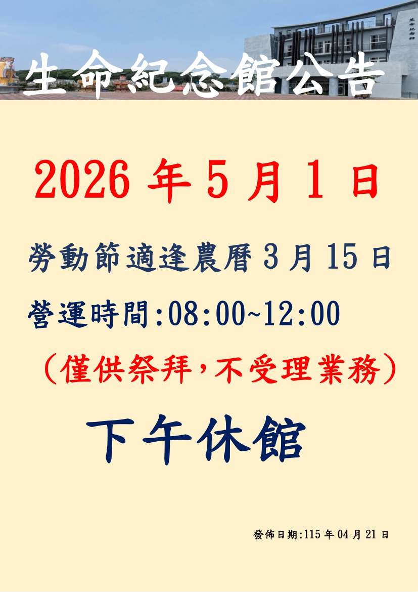 2026年5月1日勞動節適逢農曆3月15日,營運時間:08:00~12:00,下午休館。