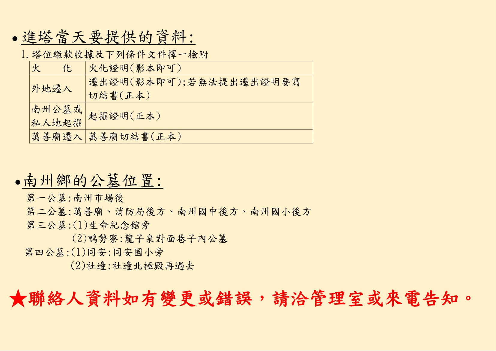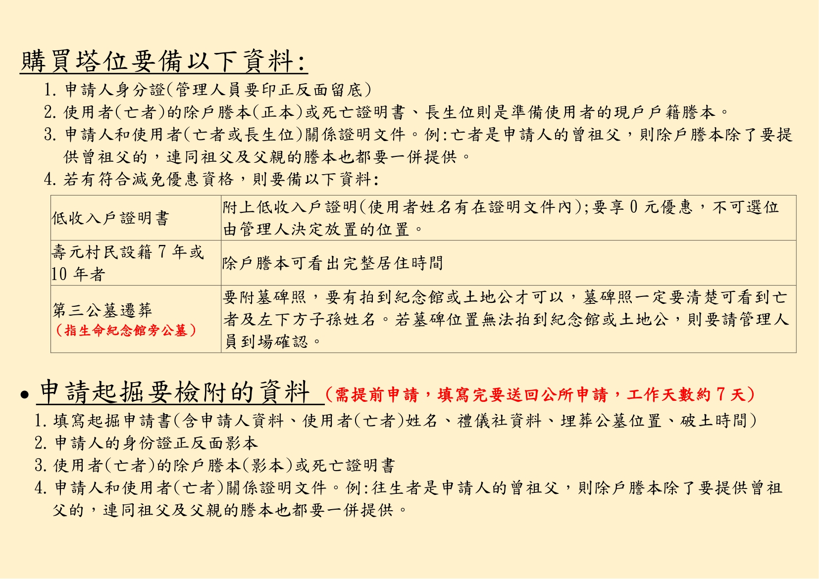 辦理從本鄉墓地起掘或是購買南州鄉生命紀念館骨灰櫃(神主牌)位需檢附的資料